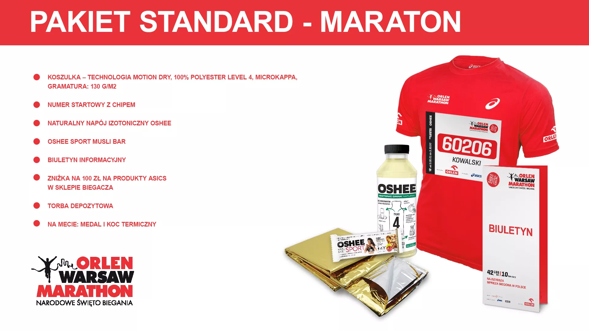 Pakiet Standard dla tego dystansu zostanie dopełniony koszulką techniczną asics z nadrukiem specjalnie przygotowanym na tę edycję ORLEN Warsaw Marathon.