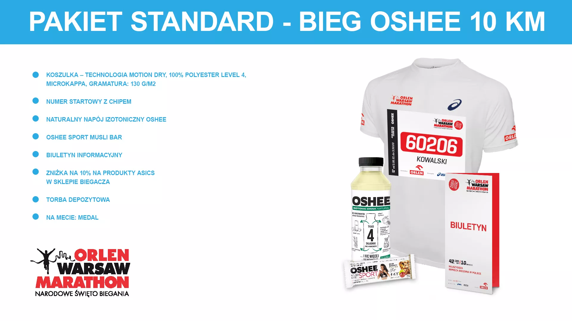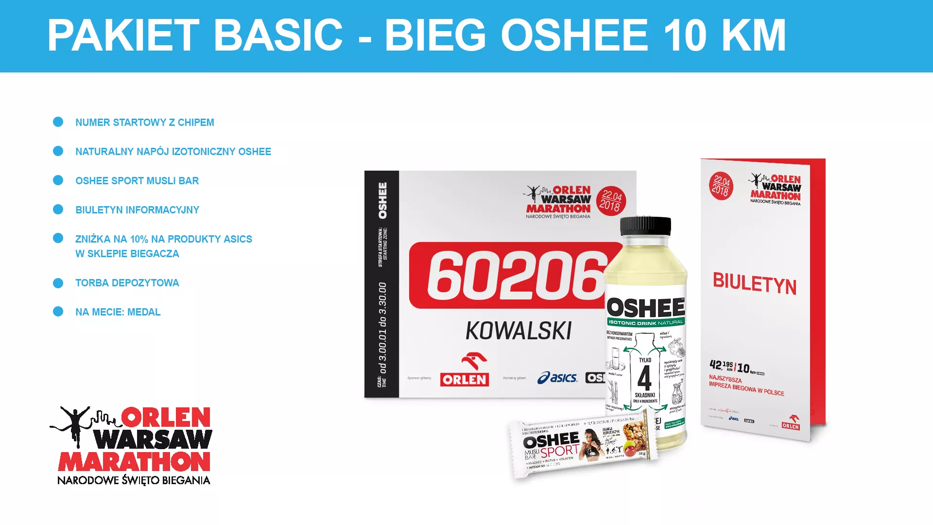 Pakiet startowy uczestników biegu OSHEE 10 km w wersji Basic składać się będzie z numeru startowego z chipem do pomiaru czasu, napoju izotonicznego OSHEE Isotonic Drink Natural, batonika Musli Bar SPORT oraz biuletynu zawierającego przydatne informacje dla biegaczy i kibiców, a także kupony zniżkowe asics.