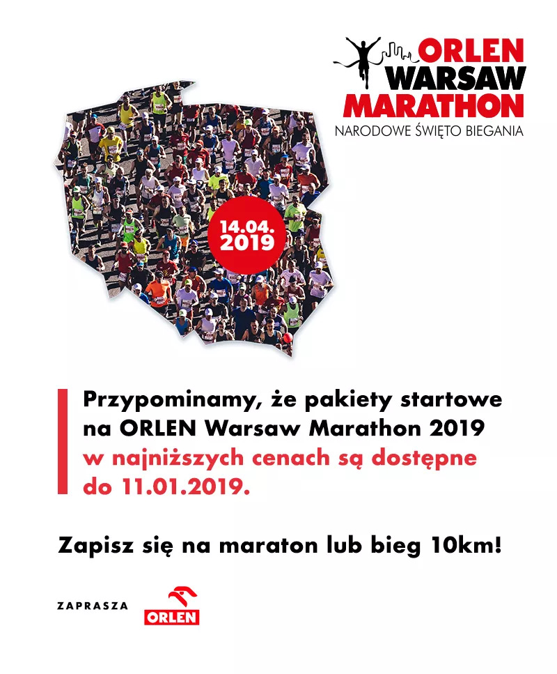 Jeśli myślisz o starcie w Warszawie, teraz może być dobry moment na zrealizowanie noworocznych postanowień. Tylko do 11 stycznia 2019 r. pakiety startowe dla wszystkich kategorii można bowiem kupić w niższych cenach. To doskonała okazja, żeby się zmotywować i przy okazji uzyskać wymarzony numer startowy - czekający pakiet będzie przypominał o nadchodzącym biegu i motywował do przygotowań. Nawet w trakcie tak pełnej wyzwań pory dla biegaczy, jaką jest zima. Dla przypomnienia, ceny dla obu biegów przedstawiają się następująco: