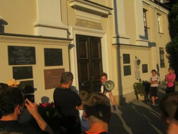 Pierwsi uczestnicy zaczęli pojawiać się pół godziny przed wyznaczoną godziną. Spokojnie czekali na przewodnika i trenera, oglądając pamiątkowe tablice na kościele bonifratrów. Grupa około 40 osób najpierw wysłuchała kilku słów o Szpitalu Psychiatrycznym im św. Jana Bożego, który mieścił się przy parafii. W trakcie powstania toczyły się tu zacięte walki, w których udział brał m.in. Batalion Zośka.