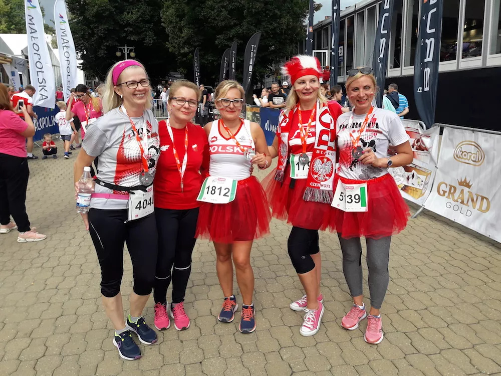 – Bogusia, Anka, Marzena, Ela, Dorota – przedstawiły się dziewczyny z ekipy O Co Biega Pabianice, które razem pobiegły po krynickim deptaku. – Kibicujemy Polsce, siatkarzom, Pabianicom i naszej drużynie O Co Biega, a na Festiwalu przede wszystkim uczestnikom Iron Run. No i sobie samym, bo wszystkie wczoraj pobiegłyśmy VisegRun na 35 km albo Życiową Dziesiątkę. Mięśnie dziś bolały, trochę powłóczyłyśmy nogami, ale dałyśmy radę razem przebiec jeszcze te 600 metrów. – Dla mnie Bieg Kibica miał dwa kilometry – zakończyła ze śmiechem jedna z pań – bo miałam bardzo daleko zaparkowany samochód!