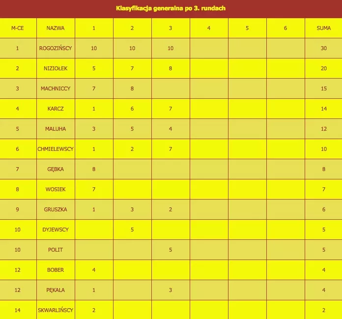 Rumieńców nabiera też klasyfikacja rodzinna. Zdecydowanymi liderami pozostają bracia Rogozińscy, broniący tytułu najbardziej rozbieganej na Gutwinie rodziny wywalczonego przed rokiem. Wygrali wszystkie trzy dotychczasowe rundy i z kompletem 30 punktów prowadzą w klasyfikacji generalnej.