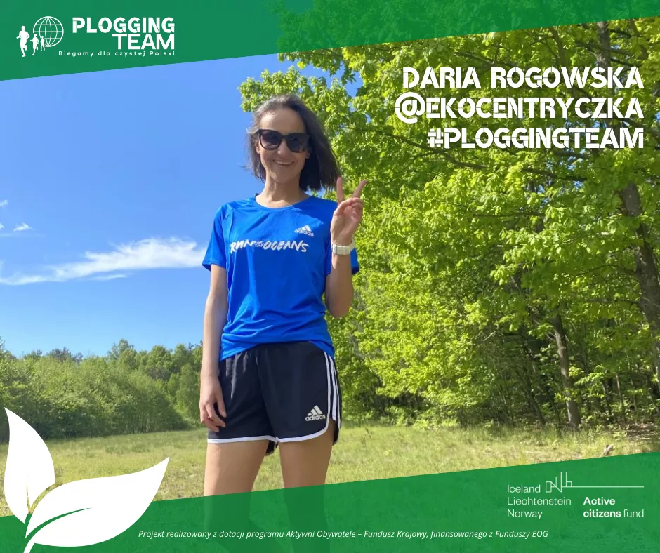 Pani Daria od 10 lat prowadzi bloga ekocentryczka.pl, na którym promuje zdrowe odżywianie i ekologiczne podejście do życia. “Od 8 lat regularnie biegam w drużynie VegeRunners i plogging jest mi bliski. Mam na koncie kilka maratonów i ochotę na więcej.” - mówi pani Daria. “Niestety lasy, w których często biegam są zanieczyszczone, już kilkakrotnie brałam udział w akcjach sprzątania. Częściej po prostu zabieram śmieci, które leżą na biegowej ścieżce.”