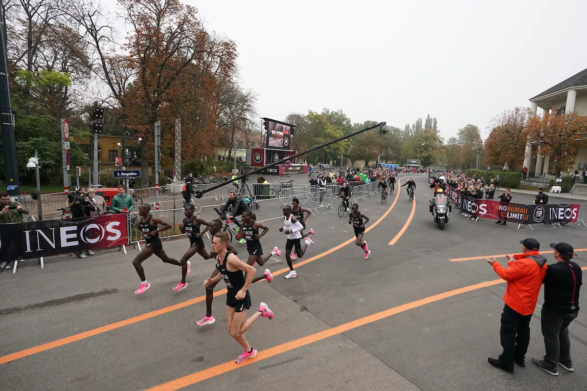 Na 35. kilometrze Kipchoge zameldował się po 1:39:23. W kluczowej dla końcowego wyniku części wyzwania, z potencjalną ścianą wyrastającą z głównej alejki parku Prater (Hauptallee) tempo biegu nie spadało - od 33. do 39. kilometra grupa biegła równo po 2:50 min./km! – To jest niesamowite! Eliud jest panem swojego ciała! Zrobi to! – mówił Patrick Tiernan, który w roli zająca towarzyszył Kipchoge od 30 do 35. kilometra wiedeńskiej próby.