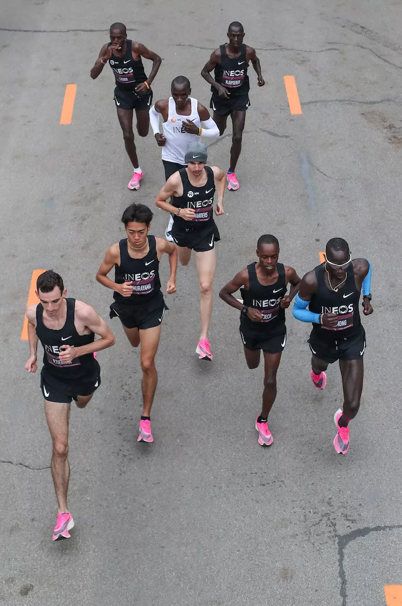 Począwszy od szóstej grupy pacemakerów, prowadzonej przez Erica Kiptanui, składy były rotowane. Organizatorzy postawili w sumie na 9 rotacji, a sami pacemakerzy zmieniali pozycje w grupie. Ostatnia grupa zająców, pod wodzą kapitana Bernarda Lagata, doprowadziła Eliuda Kipchoge do mety, pokonując dystans 7,2 km.