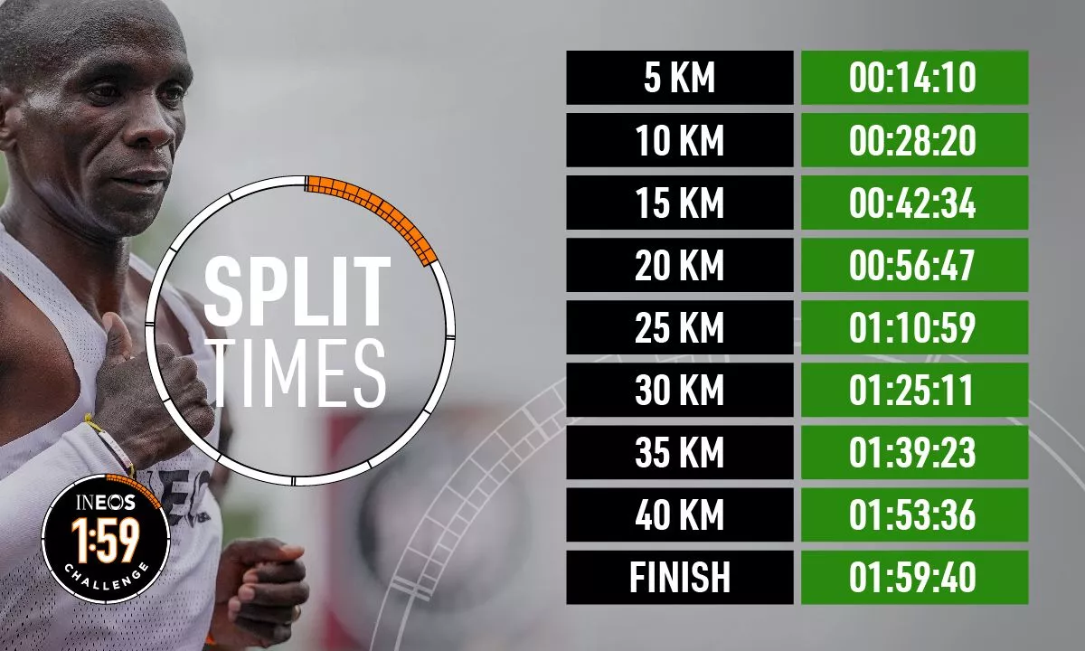 Na 23. kilometrze Kipchoge miał 9 sekund przewagi nad wynikiem 1:59:50. Od 24. do 28 kilometra tempo biegu było perfekcyjne – 2:50 min./km, a na 29. kilometrze nawet powyżej oczekiwań – 2:48 min./km. Przewaga nad pożądanym wynikiem powróciła do 10 sekund.