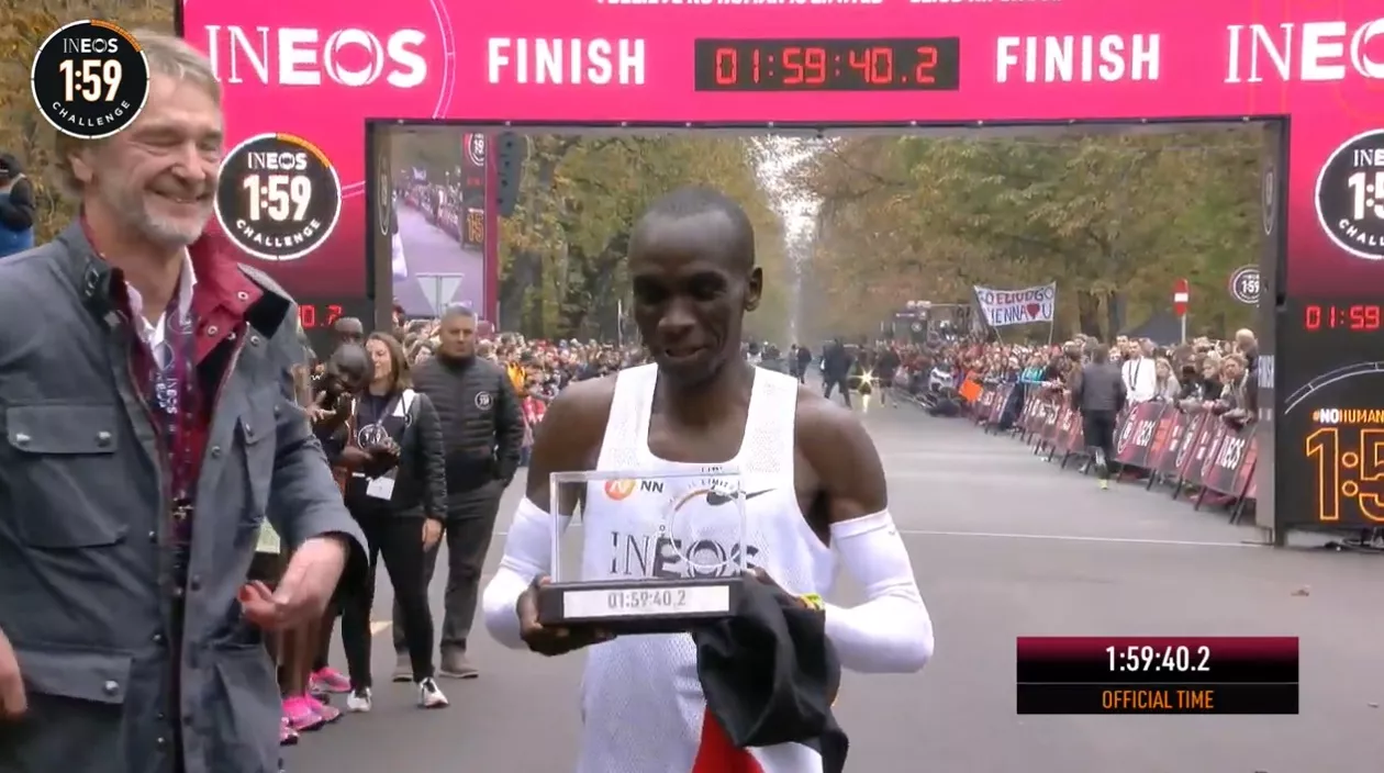 Po chwili, z rąk SIr Jimma Ratcliffe'a, fundatora INEOS 1:59 Challange, Eliud odebrał jedyne na świecie trofeum - za pokonanie maratonu poniżej 2 godzin!