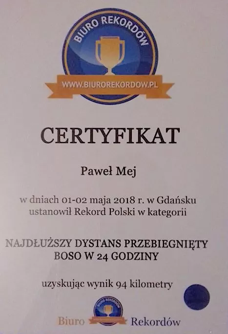 Na początku maja w Gdańsku Paweł Mej przebiegł w ciągu doby aż 93 km boso z flagą Polski, czym ustanowił Rekord Guinessa (w Polsce) w tej oryginalnej konkurencji. Bochnianin odebrał właśnie certyfikat potwierdzający to osiągnięcie.
