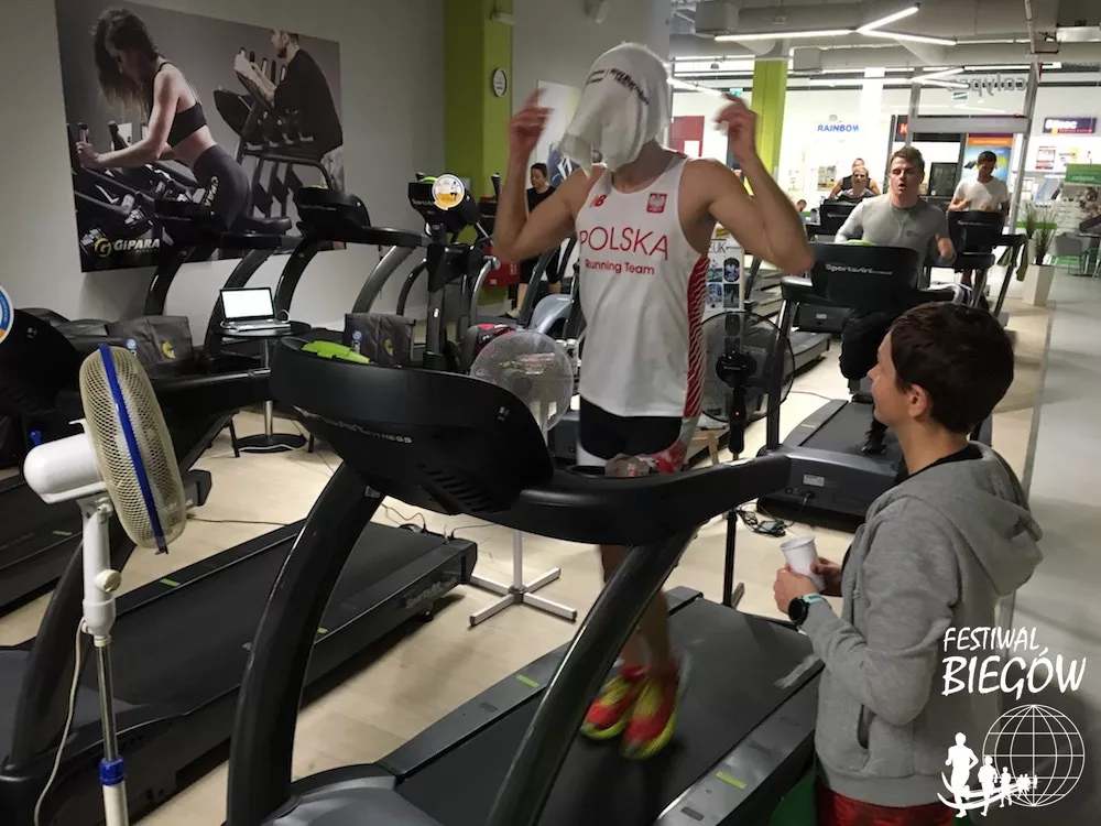 Mimo, że biegam już trochę na bieżni, to jednak pewne rzeczy mnie zaskoczyły. Od siódmej godziny biegu zaczęły się problemy. Gorączka… zagotowałem się trochę. Za późno zorganizowałem wiatraki.