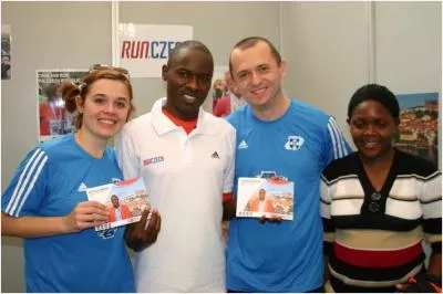 Następnego dnia w piątek udaliśmy się ponownie do Centrum Wystawowego Zappeion mieszczącego się w centrum Ogrodów Narodowych na wprost świątyni Zeusa, na spotkanie z aktualnym rekordzistą świata Patrickiem Makau (Berlin ’11 – 2:03:38). Patrick przyjechał wraz z żoną i córką do Aten, aby promować maraton w czeskiej Pradze planowany na 12 maja 2013r. Zgodził się także na wspólne zdjęcie oraz złożył swój autograf na czapeczce z logiem mojego sponsora – Festiwalu Biegowego w Krynicy.