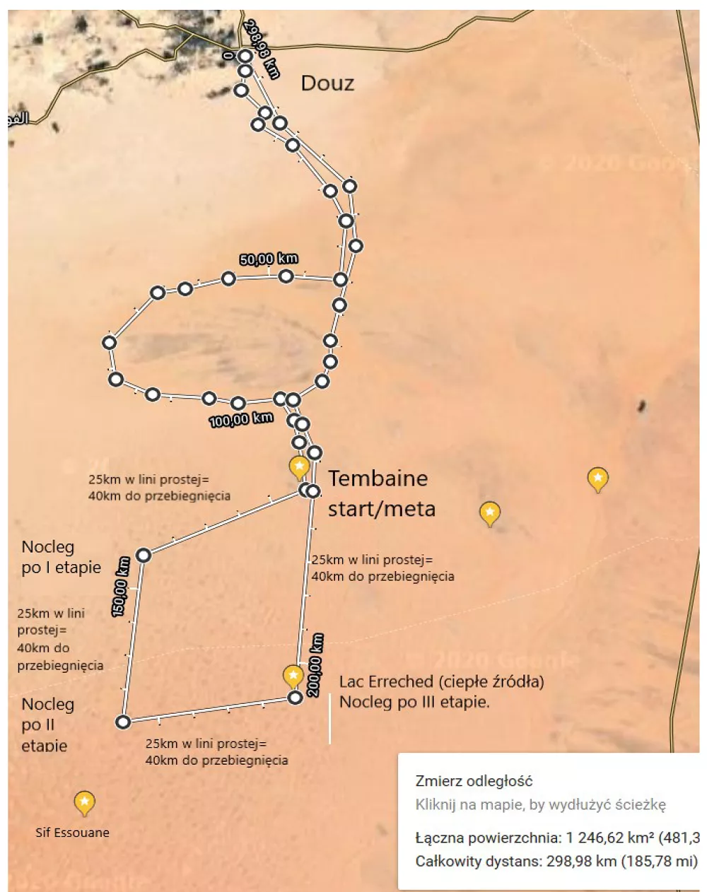 – To będzie pierwszy na świecie ultramaraton w całości poprowadzony przez ocean saharyjskich wydm – deklarują organizatorzy. – Trzej śmiałkowie wyruszą z Café Tembaine, gdzie są największe wydmy na Saharze, poprzez słone jeziorka Lac Erreched i położony w sercu pustyni Sif Essouane z powrotem do Tembaine. – Trasa liczy sobie 100 mil długości, ale w rzeczywistości będzie to dużo, dużo więcej, bo szlak przebiega w całości przez kopny, pustynny piach. Celem jest pokonanie niezdobytego dotąd biegowo terenu Wielkiego Ergu Wschodniego w Tunezji i dotarcie do Serca Sahary – mówią pomysłodawcy.