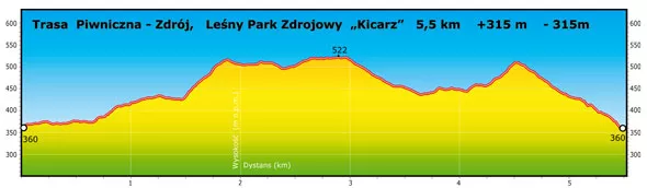 Trasa prowadzi alejką oznaczoną niebieskim Szlakiem Gminnym lekko w górę potem wzdłuż drogi i następnie serpentynami w górę na Siodło Kicarza. Dalej już szlakiem żótym w prawo, (kierunek Karpały, Zagrody) i w dół do szlaku czerwonego. Szlakiem czerwonym powrót na Siodło i dalej do punktu startu.