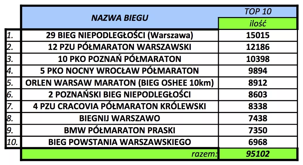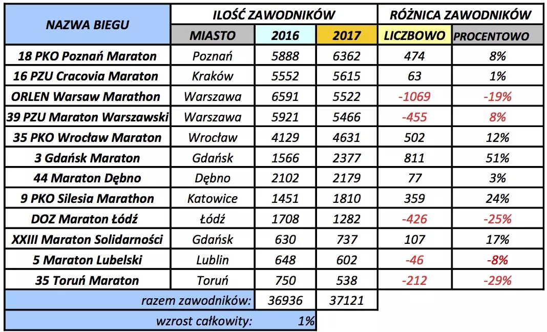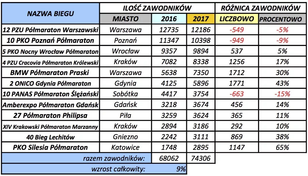 Najlepiej rozwijają się biegi na dystansie półmaratonu. Spadek frekwencji zaliczyły tylko 3 z 12 imprez, które zostały wzięte pod uwagę. Całkowity wzrost w tej kategorii wyniósł 9 procent, co przełożyło się na ponad 6 tysięcy więcej sklasyfikowanych niż rok wcześniej. To najlepiej radząca sobie kategoria biegów w Polsce.