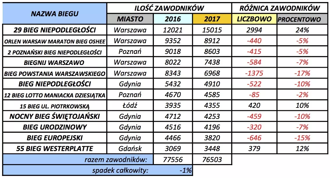 Wśród biegów na 10 km, tylko trzy z dwunastu największych imprez zaliczyły wzrost.Liderem w tej kategorii jest warszawski Bieg Niepodległości, który w 2017 roku ukończyło o 2994 biegaczy więcej niż rok wcześniej. Całkowity wzrost frekwencji wyniósł -1 procent, co oznacza, że w 12 największych biegach na dystansie 10 kilometrów w tym roku sklasyfikowano o tysiąc biegaczy mniej niż w 2016 roku.