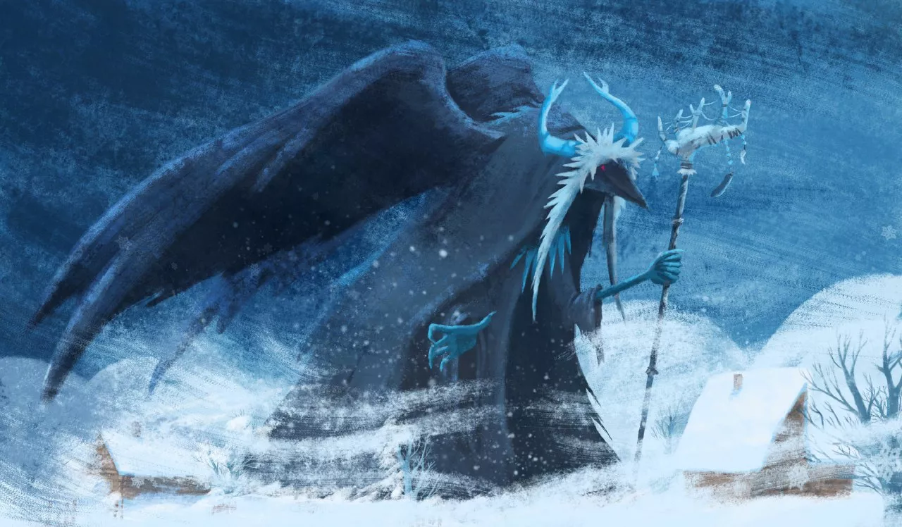 Bajkowa Ewa była dziewczynką o gorącym sercu, co nie spodobało się złemu duchowi, zamieszkującemu najzimniejsze miejsce na ziemi. Posługując się podstępem zamroził Ewę.
