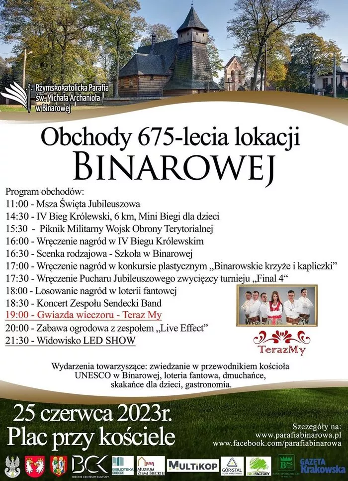 W tym dniu odbędzie się także Festyn Parafialny z okazji 675-lecia lokacji Binarowej przez Króla Kazimierza Wielkiego. Wszelkie pytania dotyczące IV Biegu Królewskiego prosimy kierować: ks. proboszcz Bogusław Jurczak tel. 504646865 – mail