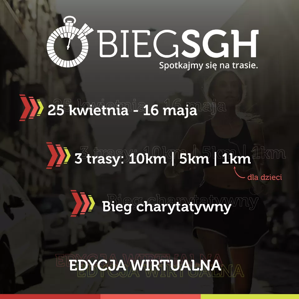 To już ósma edycja Biegu SGH – wydarzenia organizowanego przez Samorząd Studentów Szkoły Głównej Handlowej. W trosce o zdrowie w tym roku bieg odbędzie się w formie online. Oznacza to, że każdy będzie mógł uczestniczyć w wydarzeniu z dowolnego miejsca na świecie – swoje wyniki można rejestrować za pomocą aplikacji. Bieg rozpocznie się 25 kwietnia i potrwa aż do 16 maja. W tym czasie uczestnicy będą mieli okazję pobiec na trzech dystansach: 5km, 10km oraz na trasie o długości 1km przeznaczonej dla dzieci. Ponadto będzie można wziąć udział w zmaganiach drużynowych, m.in. o Puchar Uczelni, Puchar Liceów czy Puchar Organizacji Studenckich. Dodatkowo co tydzień będą wyłaniani najlepsi biegacze na poszczególnych trasach, którzy otrzymają specjalne nagrody. Zapisów można dokonywać do 15 maja, a każdy uczestnik otrzyma pakiet startowy.