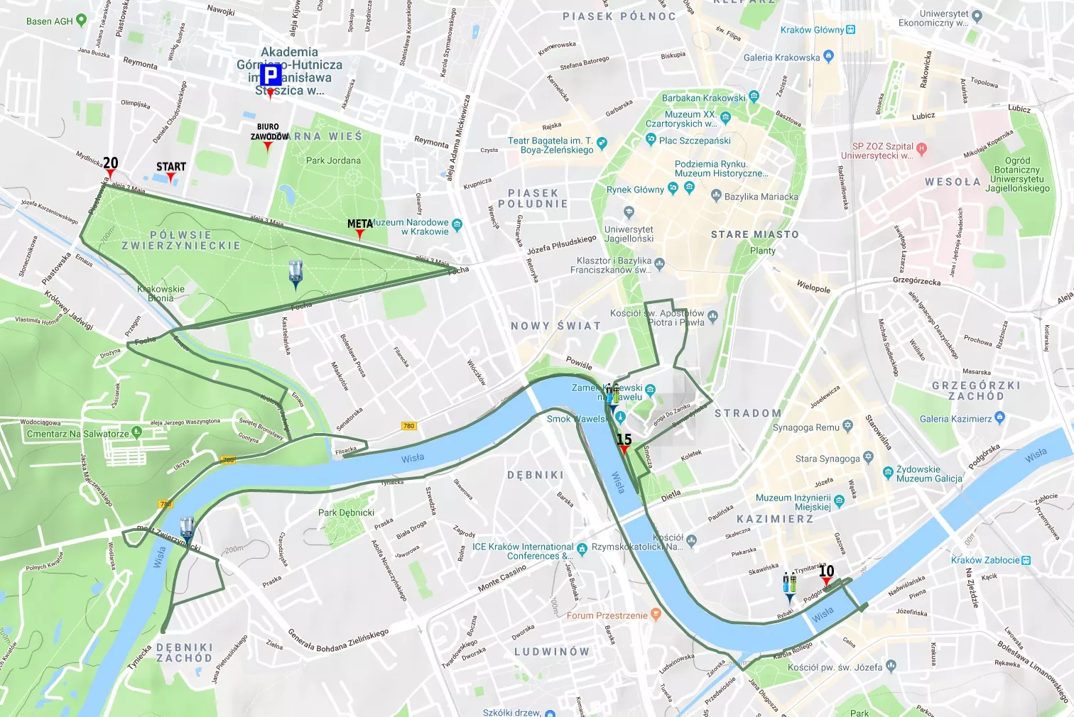 Przebieg trasy: START 3 Maja (deptak) – Focha (deptak) – Focha – most na Rudawie – Focha (prawa str. jezdni) – Królowej Jadwigi – Salwator – Księcia Józefa – Most Zwierzyniecki – Zielińskiego – Bulwar wzdłuż Tynieckiej – Bulwar Poleski – Bulwar Wołyński – Ludwinowska – Most Retmański – Rollego – Bulwar Podolski – Kładka Bernatka – Bulwar Kurlandzki – Bulwar Inflandzki – Bernardyńska (po I pochylni) – Idziego – Kanonicza – Senacka – Poselska – Planty – Podzamcze – Centrum Informacji Turystycznej – Smok Wawelski – Bulwar Czerwiński(II pochylnią) – Bulwar Rodła –Flisacka – Kościuszki – Salwator – Królowej Jadwigi (prawa str. Jezdni) – Gryfity – Emaus – Focha (deptak i lewa str. jezdni nawrót w okolicy stacji rowerów miejskich) – Focha (deptak) – ) – Na błoniach Piastowska (chodnik i parking – 3 Maja (deptak) – META
