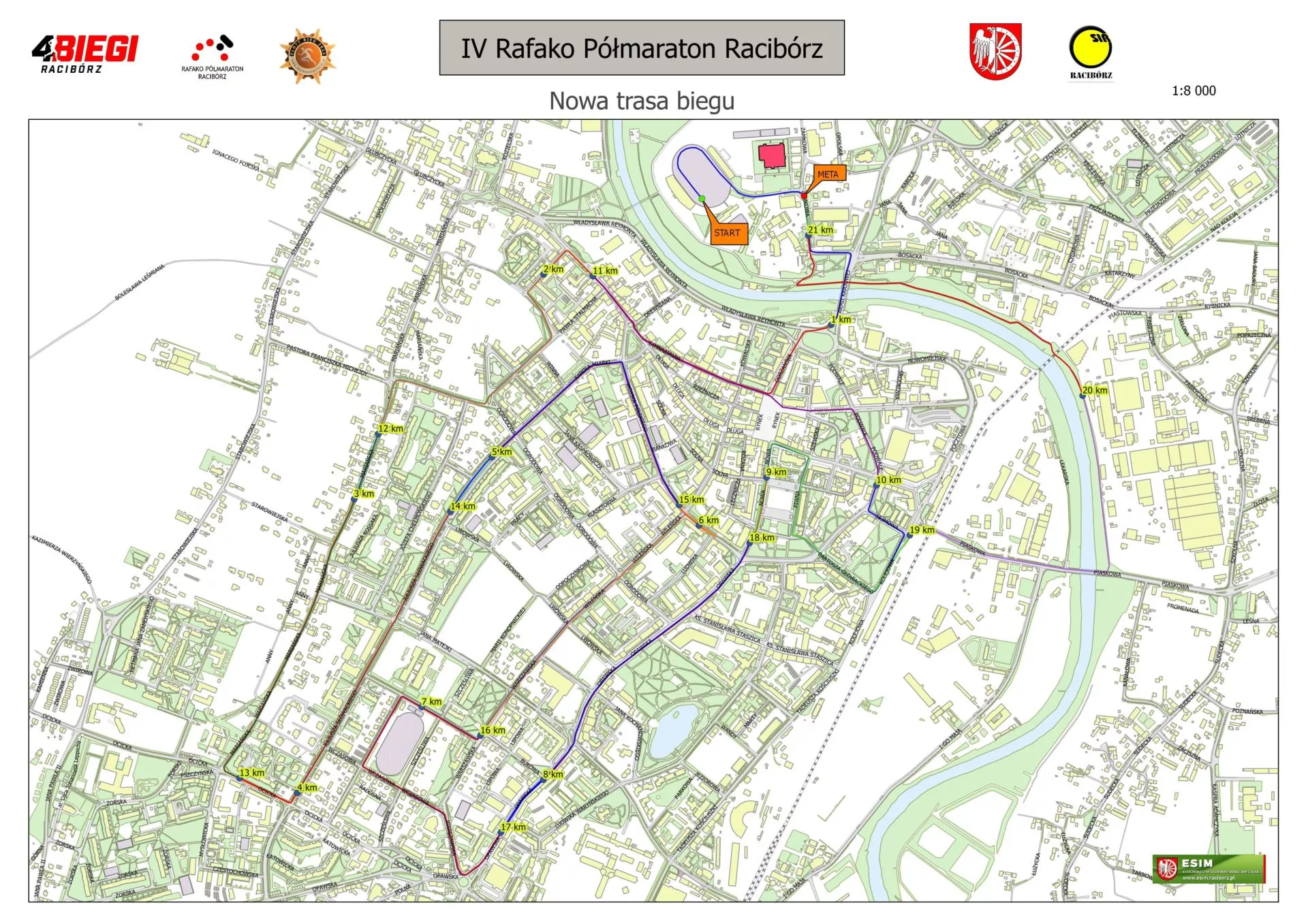Patrząc na mapę, trasa niewiele się zmieni. Nadal zawodnicy przemierzać będą centralne ulice Raciborza. Zawodnicy pobiegną następującymi ulicami: Zamkowa, Armii Krajowej, Odrzańska, Chopina, Gimnazjalna, Londzina, Różyckiego, Dąbrowskiego, Stalmacha, Boh. Westerplatte, Michejdy, Mariańska, Ocicka, Słowackiego, Miarki, Wojska Polskiego, Wileńska, Warszawska, Żeromskiego, Wyszyńskiego, Wczasowa, Warszawska, Pl. Konst. 3 Maja, Opawska, Nowa, Mickiewicza, Szewska, Piwna, Basztowa, Głowackiego, Kolejowa, Sejmowa, Drzymały, Podwale, Batorego, pl. Dominikański, Rynek, Chopina. Tak będą wyglądały dwie pętle. Końcówka biegu z ul. Kolejowej prowadzić będzie w ul. Piaskową i wałami wzdłuż rzeki Odry i wróci do ul. Zamkowej.