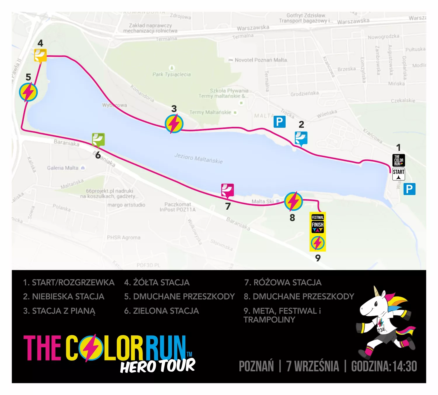 Będzie można spotkać również superbohaterów z bajek i komiksów. Podczas poznańskiego wydarzenia zaplanowane jest łącznie 5 fal, które startują o godzinach: 15:00, 15:30, 16:00, 16:30, 17:00. Tuż po nich, od 17:00 rozpocznie się zabawa w strefie festiwalowej, która potrwa do 19:00. W tym czasie uczestnicy będą mogli skorzystać z atrakcji i animacji przygotowanych przez organizatorów i partnerów wydarzenia. Będzie też można posłuchać muzyki, obejrzeć eksplozje kolorów, poskakać na trampolinie w strefie bohatera, czy też zrobić sobie zdjęcie z wielkim jednorożcem.