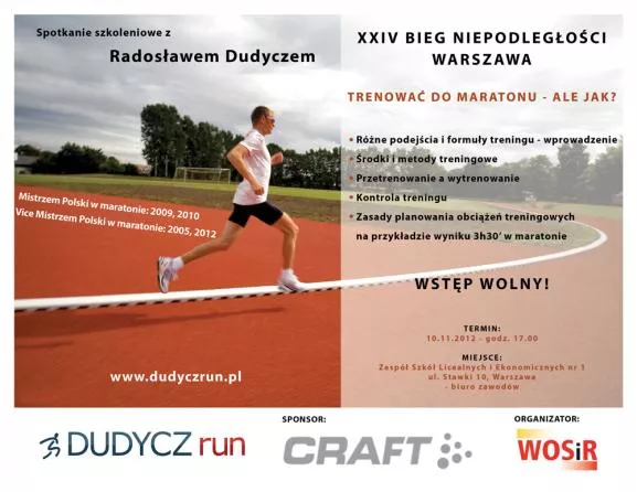 Przed XXIV Biegiem Niepodległości, 10 listopada odbędzie się spotkanie z Radkiem Dudyczem, Mistrzem Polski w maratonie z roku 2009 i 2010 i ambasadorem marki CRAFT.