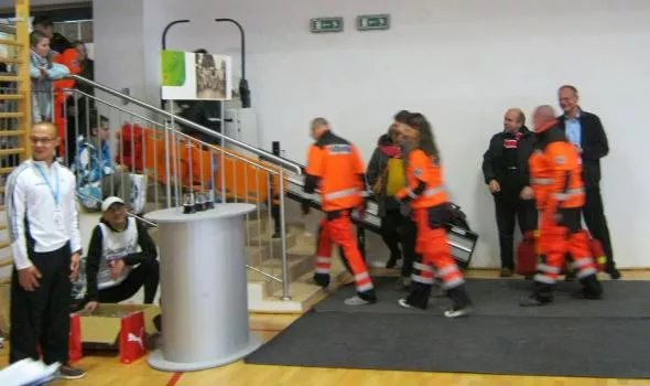 Ceremonia zakończenia imprezy odbyła się w pobliskiej szkole – w cieplejszych warunkach i przy gorącej herbacie i poczęstunku. Podczas wręczania nagród doszło do dramatycznej sytuacji. Zasłabła jedna z kobiet, która stała pod ścianą. Ratownicy medyczni szybko udzieli jej pomocy, ułożyli na noszach i wynieśli z sali. Zrobiło się cicho, wszyscy życzyli dobrze tej dziewczynie mając w pamięci sytuację z „Biegnij Warszawo”.