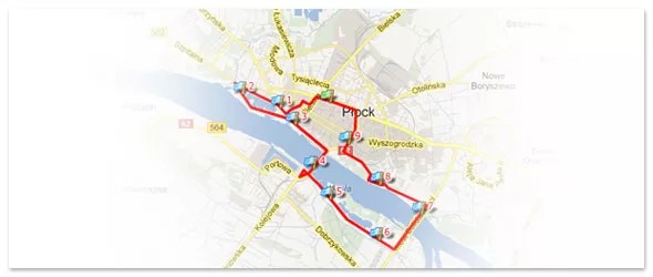 Druga trasa prowadzi przez centrum Płocka oraz nad Wisłę. Charakterystyczne, ciekawe punkty na trasie - Płockie wzgórze Tumskie, dwa Płockie mosty nad rzeką Wisłą. Rodzaj nawierzchni - asfalt 60%, wał wiślany o nawierzchni naturalnej 30%, beton 10%. Profil trasy - pofałdowana. Dodatkowe ważne informacje - po trasie można biegać również po zmroku i przed świtem.