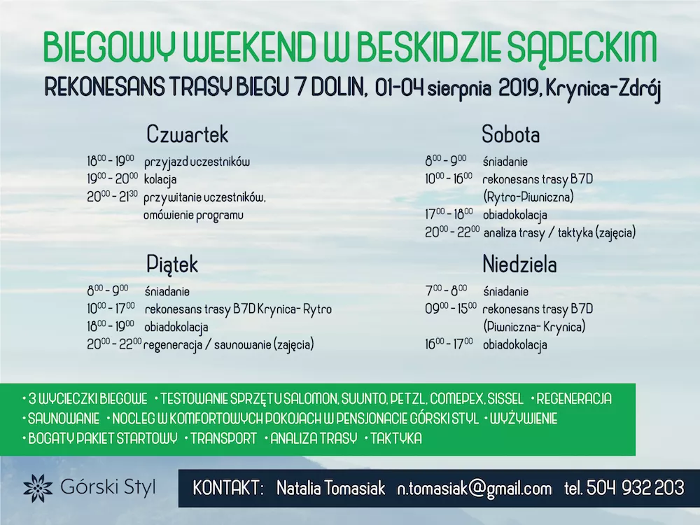 Podczas rekonesansu, pomożemy Ci przygotować się kondycyjnie, technicznie i taktycznie do biegania po szlakach Beskidu Sądeckiego, a przede wszystkim pokażemy bardziej świadome podejście do biegowej pasji, zwracając szczególnie uwagę na kwestie związane z Biegiem 7 Dolin,