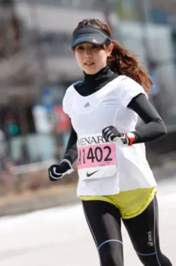 Niestety w pobliżu punktu z wodą na 15. kilometrze przewróciła się i boleśnie potłukła. Resztę drogi pokonała z krwawiącym kolanem i łokciem. Nie przeszkodziło jej to w zajęciu trzeciego miejsca z czasem 2:22:48, co jest jej nowym rekordem życiowym i jednocześnie ósmym najszybszym czasem uzyskanym przez Japonkę w historii. Drugiej na mecie, Kowalowej dała się wyprzedzić dopiero na 32 kilometrze.