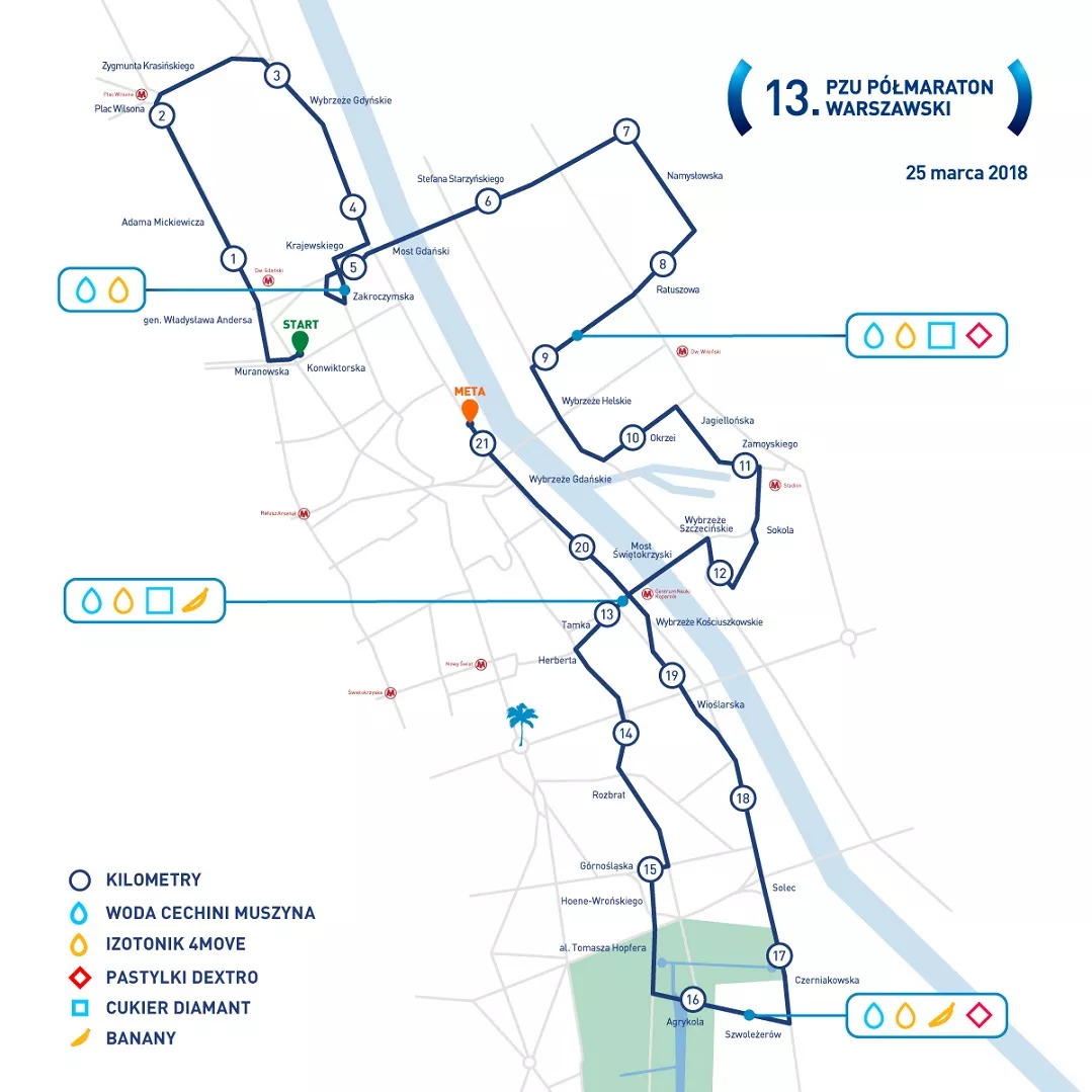 Trasa 13 PZU Półmaratonu Warszawskiego będzie inna niż w latach ubiegłych. To zresztą nic nowego. – W historii półmaratonu tylko 3 razy z rzędu udało nam się zorganizować bieg na tej samej trasie – mówi Marek Tronina. – W mieście wciąż coś się dzieje: remonty, budowa obwodnicy. I znów musieliśmy wprowadzić zmiany – tłumaczy.Po raz pierwszy zatem start - po Placu Trzech Krzyży i Placu Teatralnym - znajduje się przy stadionie Polonii, potem do pokonania dwa mosty, a więc biegacze zaliczą obie strony Warszawy. Meta na Wisłostradzie przy Parku Fontann, tak jak kończył się ubiegłoroczny 39 Maraton Warszawski (aczkolwiek biegacze będą finiszować od strony Mostu Grota Roweckiego, w ubiegłym roku od strony tunelu).