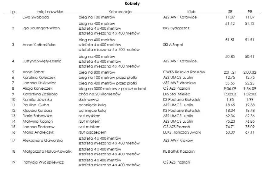Wśród pań trzon ekipy stanowią Aniołki Matusińskiego, stawiane w gronie faworytek sztafety 4 x 400 metrów. W polskim zespole nie zabraknie także m.in. wracającej na wielką światową imprezę Marii Andrejczyk, czy legitymujących się medalami mistrzostw Europy i świata młociarek Joanny Fiodorow i Malwiny Kopron.