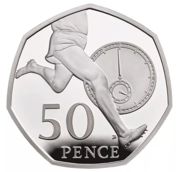 Brytyjska pięćdziesięciopensówka kończy w tym roku 50 lat. Z tej okazji królewska mennica wyda limitowaną serię monety z motywem biegowym, przypominającym o historycznym wyczynie Rogera Bannistera, który w 1954 r. jako pierwszy człowiek pobiegł 1 mile poniżej 4 minut.