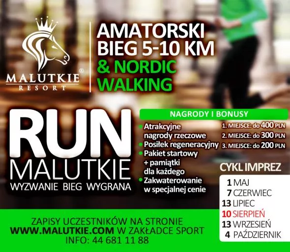 Malutkie RUN to cykl biegów (5 i 10 km) i zawodów nordic walking (5 km), które zapisały się już (mamy nadzieję, że na stałe) na sportowej mapie Polski. Atrakcją biegów są z pewnością piękne, zielone trasy oraz podsycające emocje nagrody. Pula nagród w każdym biegu to ponad 3000 zł, a w klasyfikacji generalnej po wszystkich biegach to ponad 10000 zł.
