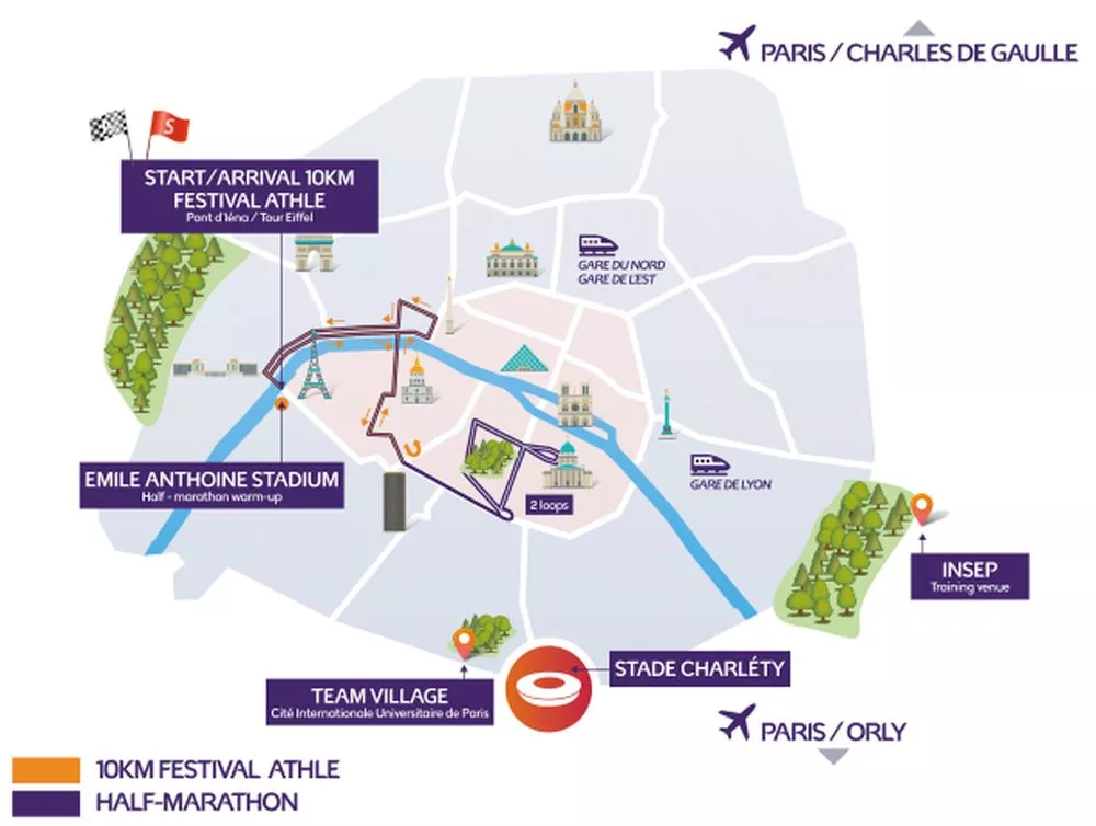 Ideą masowego biegu na 10 km jest wyjście poza stadion i włączenie kibiców w sportowe wydarzenia. Wystartuje w nim ok. 1500 biegaczy. Na trasę wybiegną tuż po półmaratonie i pokonają pierwsze i ostatnie 5 km tego dystansu. Start będzie odbywał się falami. Pierwsza pobiegnie o godz. 11 z Pont d’Léna, mostu , który łączy brzegi Sekwany. Po jednej stronie stoi Wieża Eiffla, po drugiej znajduje się Trocadero. Budowa tego mostu została zlecona dekretem podpisanym przez Napoleona w Warszawie. Trasa z jednej strony ma umożliwić rywalizację na tej samej arenie, na której o medale walczyli zawodnicy, z drugiej pokazać zabytki Paryża.