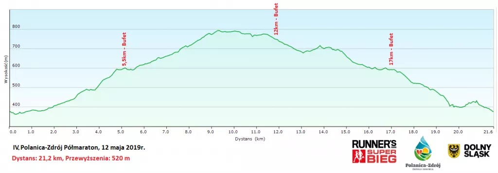 Górski półmaraton ma 22 km i przewyższenie sięgające 520 metrów. Trasa ,po wyprowadzeniu na odpowiednią wysokość w rejonie Nowej Sokółki i ucieczce z centrum uzdrowiska (do którego oczywiście wróci), kręci się między szczytami Wolarza, Rudnika i Złotej – cały czas w bezpośredniej bliskości doliny Bystrzycy Dusznickiej i mety. Stromy zbieg do Polanicy powinien dosłownie nieść zawodników przez ostatni odcinek trasy.