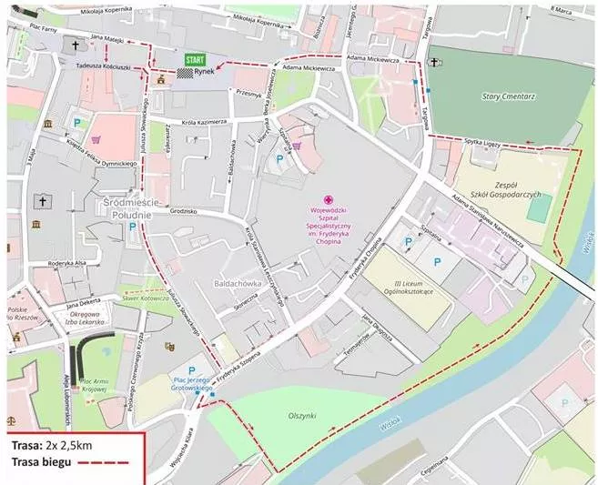 Trasa biegu prowadzić będzie centralnymi ulicami miasta — począwszy od rzeszowskiego Rynku, poprzez ul. J. Słowackiego, Bulwary nad Wisłokiem, ul. Spytka Ligęzy, ul. Targową, ul. Adama Mickiewicza i ponownie na rzeszowskim Rynku kończąc. Długość trasy wynosi 5 km (dwa okrążenia).