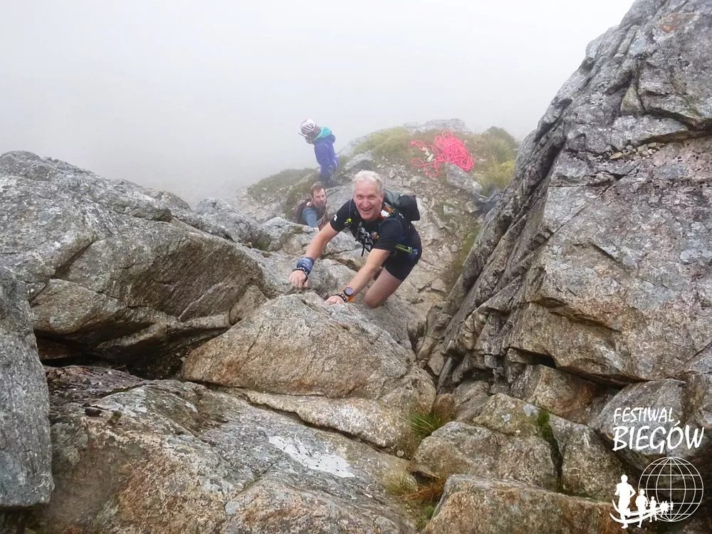 After the night rain the rock is wet in places. There are a few almost vertical bits, but all have juggy holds. For me it's the best fun. Talking to fellow runners I learn they have climbing experience too. It confirms that the British Moderate grade, i.e. scrambling Grade 3, equals Grade II UIAA. For me it's similar in character and difficulty to the final section of Martin's route at Gerlach, the Tatras' highest peak in Slovakia.