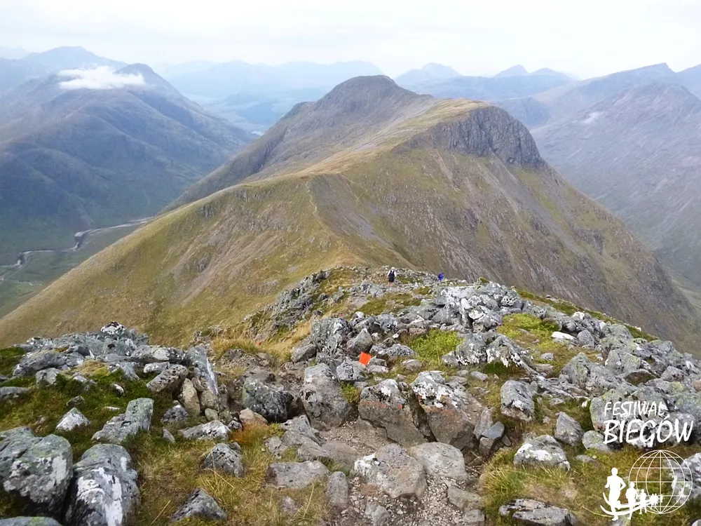 The ridge is Aonach Eagach. Easier climbed than pronounced. Last year it was out due to gale force wind. The second hardest section of the race, grade 2 scrambling, i.e. UIAA grade I. At the summit of Sgorr Nam Fiannaidh (967 m) I catch up with those two, say hi to them and the marshalls and run ahead.