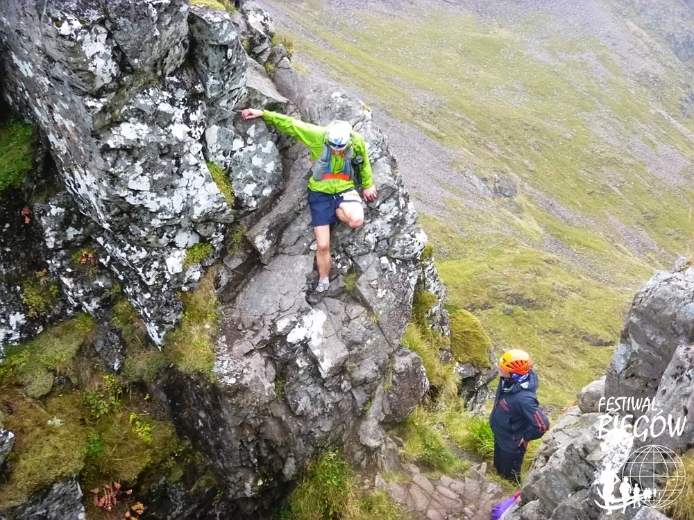 The whole ridge is about 5 km long but some of its parts are runnable. The pinnacles offer some fine scrambling. Members of the safety crew take care of the most difficult places. This would be great craic if I wasn't so ultimately knackered. I romp through scrambling sections and technical descents but on every single uphill I gasp for breath. I downclimb one pinnacle via an overhang which can be Diff grade in climbing terms, lowering myself on juggy holds but without seeing any footholds. Scrambling the next pinnacle I see the racer following me finds a bypass from the right. It's so much like me to make my life harder...