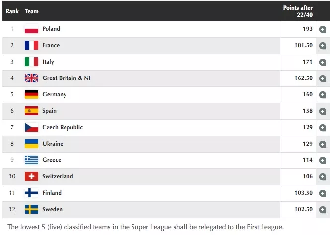 (WYJAŚNIENIE: prowadzenie Polaków to efekt dyskwalifikacji sztafety francuskiej, pierwotnie biało-czerwoni zajmowali drugie miejsce z 1,5 pkt straty do rywali).