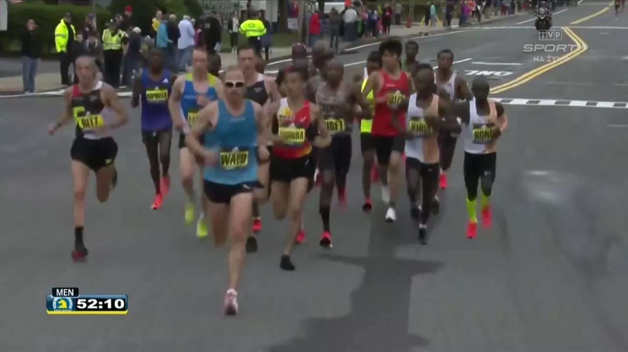 Dobrze radzili sobie Amerykanie: Jared Ward, a zwłaszcza mniej znany Scott Fauble (życiówka 2:12:28), którego rosła sylwetka często pojawiała się na czele grupy. W pewnym momencie wydawało się, że zawodnik opada z sił, gdy zbiegł nieco bardziej na prawo, jednak po chwili znów aktywnie napędzał stawkę.