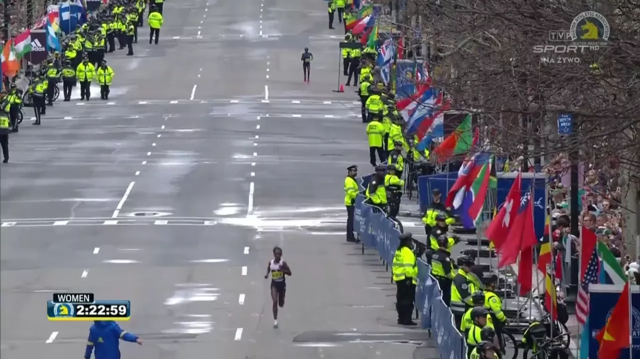 Z goniącej grupy rękawicę podjęła tylko Edna Kiplagat, zwyciężczyni Bostonu z 2017 r.. Zniwelowała straty do 58 sekund i z dystansu mogła się przyglądać poczynaniom liderki, ale przewaga rywalki była zbyt duża.