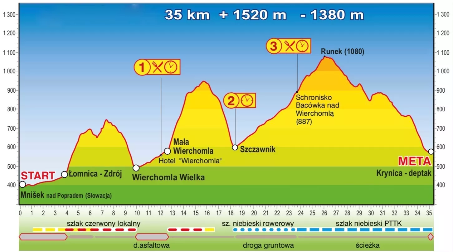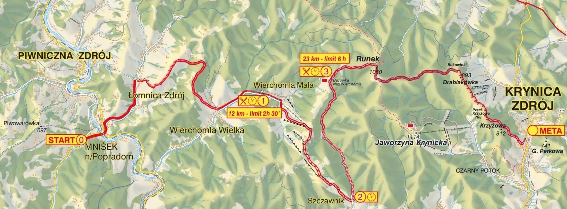 Bez zmian pozostają też limity czasowe na punktach serwisowych i żywieniowych: Hotel Wierchomla – 3h (do godz. 14:30), Bacówka nad Wierchomlą – 6,5 (do godz. 18:00). Zamknięcie mety nastąpi tradycyjnie o godz. 20:00 na krynickim deptaku.