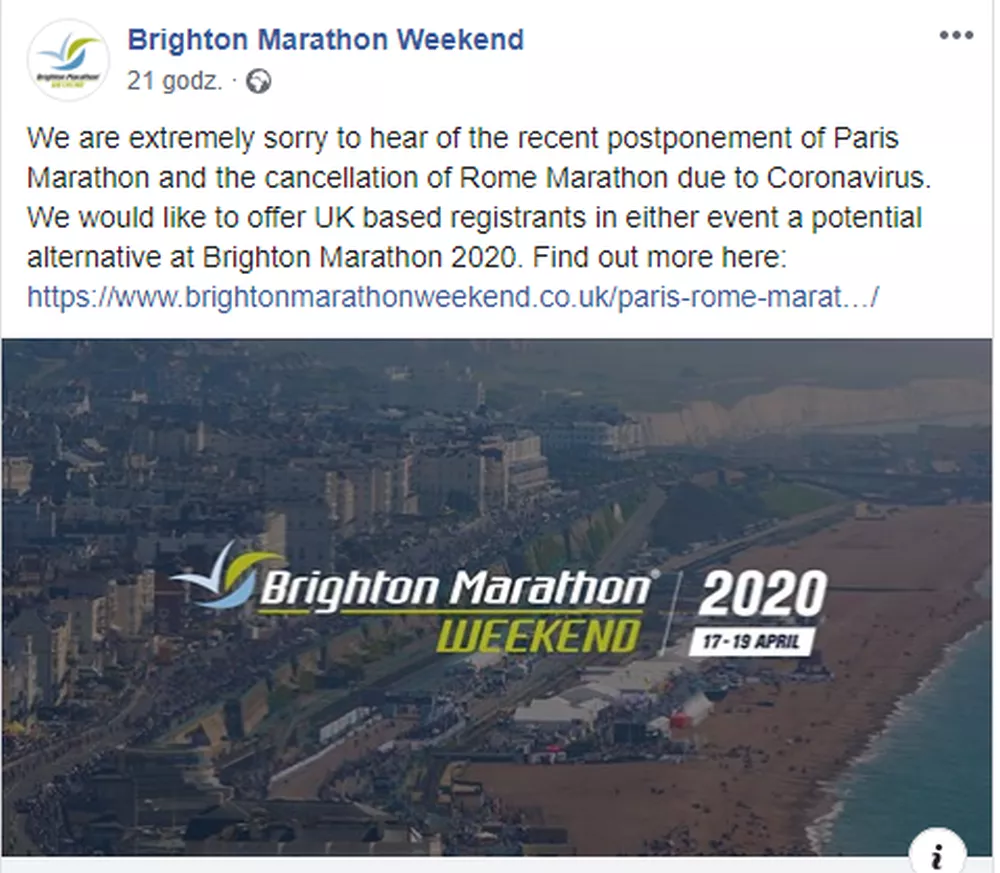 „Jest nam bardzo przykro, że bieg w Paryżu został przełożony, a w Rzymie odwołany. Dlatego proponujemy wszystkim biegaczom pochodzącym ze Zjednoczonego Królestwa możliwość startu w Brighton. Wiemy, ile wysiłku włożyliście w przygotowanie się do maratonu i będziecie rozczarowani, jeśli tej wiosny w nim nie pobiegniecie” – napisali organizatorzy.