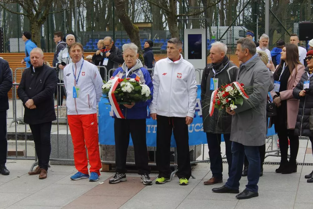 Dawne gwiazdy polskiego maratonu na 33, Biegu Zaślubin. Od lewej: Wiesław Perszke, Antoni Marczak (z kwiatami), Jan Huruk