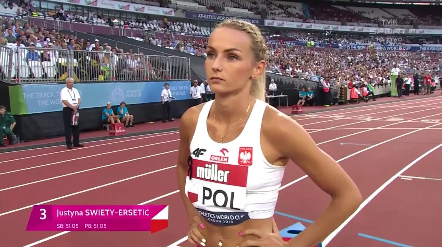 Pani Justyna pobiegła na trzecim torze, z którego mogła kontrolować rywalki. Wystrzeliła tradycyjnie na ostatniej prostej, ale tym razem sił starczyło tylko do trzeciego miejsca (czas 51.89 - blisko sekundę gorszy od najszybszego biegu sezonu). Co ważne, Święty-Ersetic wyprzedziła Brytyjkę i Amerykankę, dorzucając kolejne ważne oczka do dorobku Biało-Czerwonych. Po 6 konkurencjach Polska prowadziła jednym punktem przed Francją i czterema przed Wielką Brytanią!
