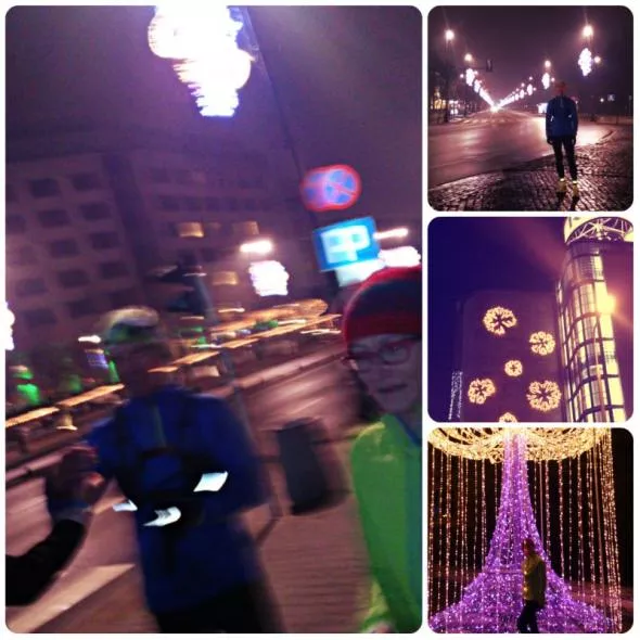Życiówki nie zrobiliśmy, w tempie konwersacyjnym biegliśmy, trasę w miarę dokładnie pokonaliśmy… Tylko jednego punktu nie udało nam się zrealizować. Na metę przybyliśmy nieco później. Zupełnie nie z naszej winy opóźnił się bowiem start. Na swoje usprawiedliwienie mamy także tłumy na trasie ciągnące na miejską imprezę sylwestrową i tłumy z imprezy wracające, czerwone światła, rozkopane ulice, świetlne iluminacje, przy których musieliśmy koniecznie zrobić sobie zdjęcie, przerwę na noworoczne życzenia, oglądanie sztucznych ogni gdzieś przy Belwederskiej… Ach, co to był za bal!