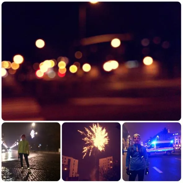 Mały postój i robi się zimno. Ruszamy więc dalej. Dobiegamy do Wybrzeża Gdańskiego. Piękna trasa, zero ludzi, równy chodnik. Przerwa na zdjęcie na tyłach Zamku Królewskiego. Coś jakby zaczyna kropić, ale szybko przestaje. Gdzieś przy Centrum Nauki Kopernik słyszymy z Endomondo – „Ten kilometers”. Jest dobrze. Na razie jeszcze nie czujemy zmęczenia. Na Wisłostradzie przeszkody, drogowe remonty. Małe biegowe objazdy, zdjęcia przy znakach drogowych i biegniemy dalej. Czerniakowska wita nas tuż przed północą. Odbijamy w prawo. Nowosielska, Podchorążych, Gagarina… I fajerwerki, wybuchy, sztuczne ognie! Właśnie mija północ. No to szczęśliwego biegowego roku!