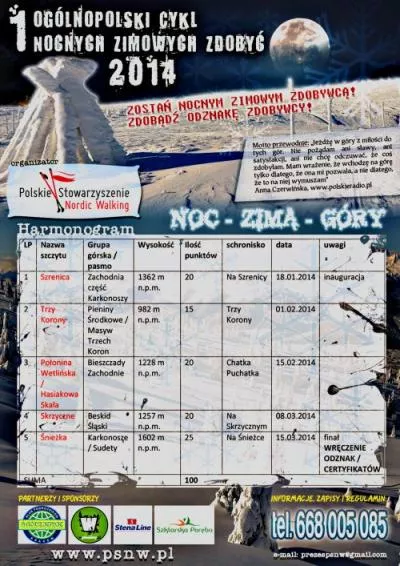 Więcej informacji o cyklu Noc-Zima-Góry 2014 można znaleźć TUTAJ, a także na stronie Polskiego Stowarzyszenia Nordic Walking. Tam także dostępny jest formularz zgłoszeniowy do cyklu.