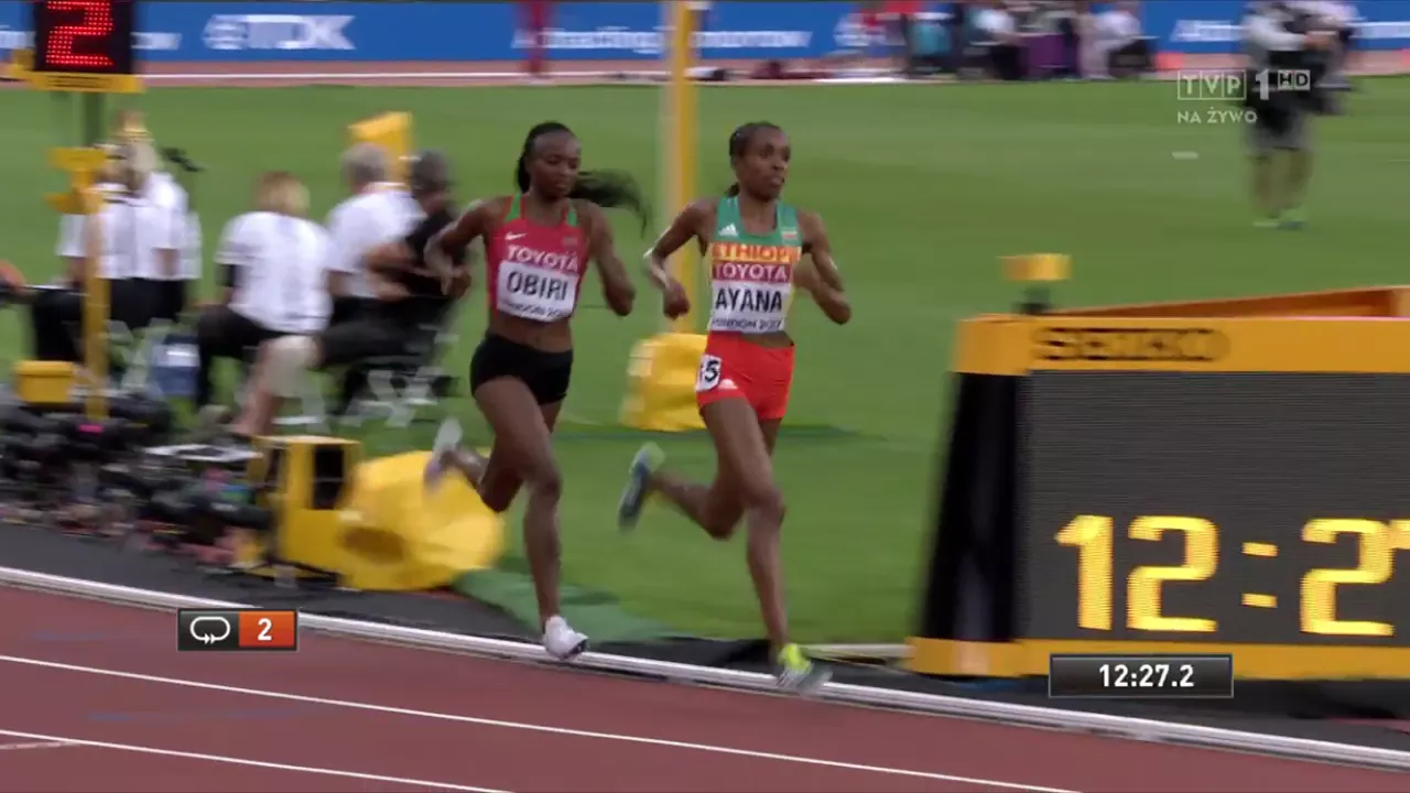 Przed dzwonkiem ostatniego okrążenia na moment zza rywalkę wychyliła się Obiri, ale spasowała. Armatę odpaliła dopiero na przeciwległej prostej. Ku zaskoczeniu wszystkich, atak pozostał bez jakiejkolwiek reakcji Ayany. Jakiejkolwiek.